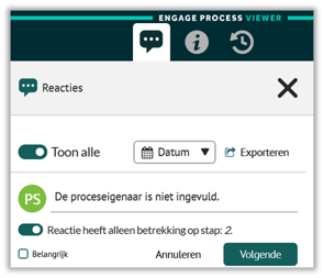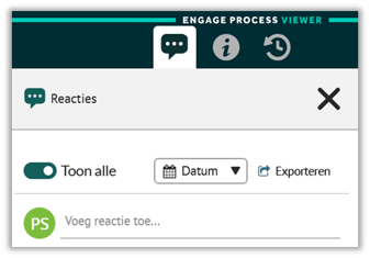 In de Viewer van Engage Process is het mogelijk om reacties te plaatsen op een proces of op een specifieke processtap, mits dit door de procesontwerper is toegestaan.