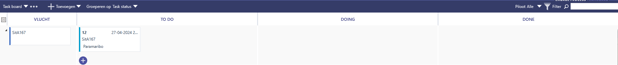 De standaardweergave toont werk-items als kaartjes. Eventuele onderliggende taken kunnen worden bekeken door het werk-item uit te klappen via het zwarte driehoekje linksboven op het kaartje.